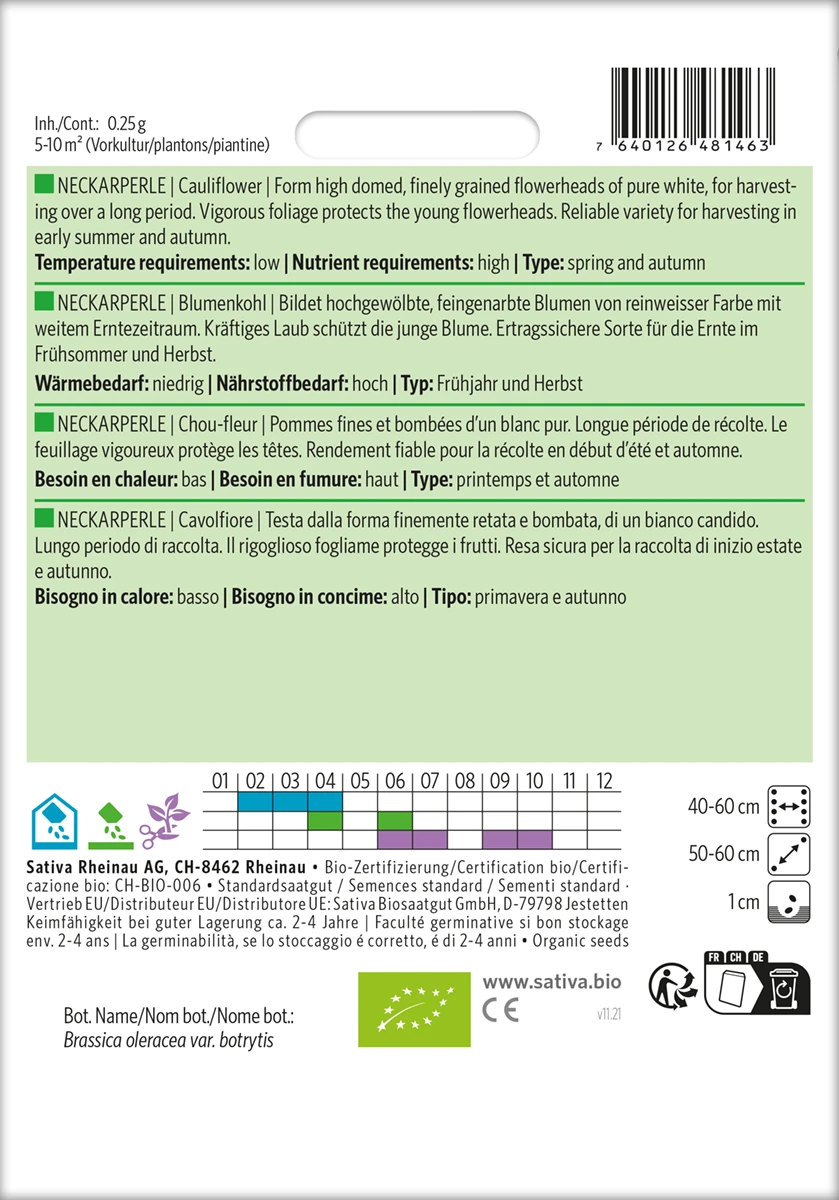 Bildet hochgewölbte, feingenarbte Blumen von reinweißer Farbe mit weitem Erntezeitraum. Kräftiges Laub schützt die junge Blume. Ertragssichere Sorte für die Ernte im Frühsommer und Herbst.