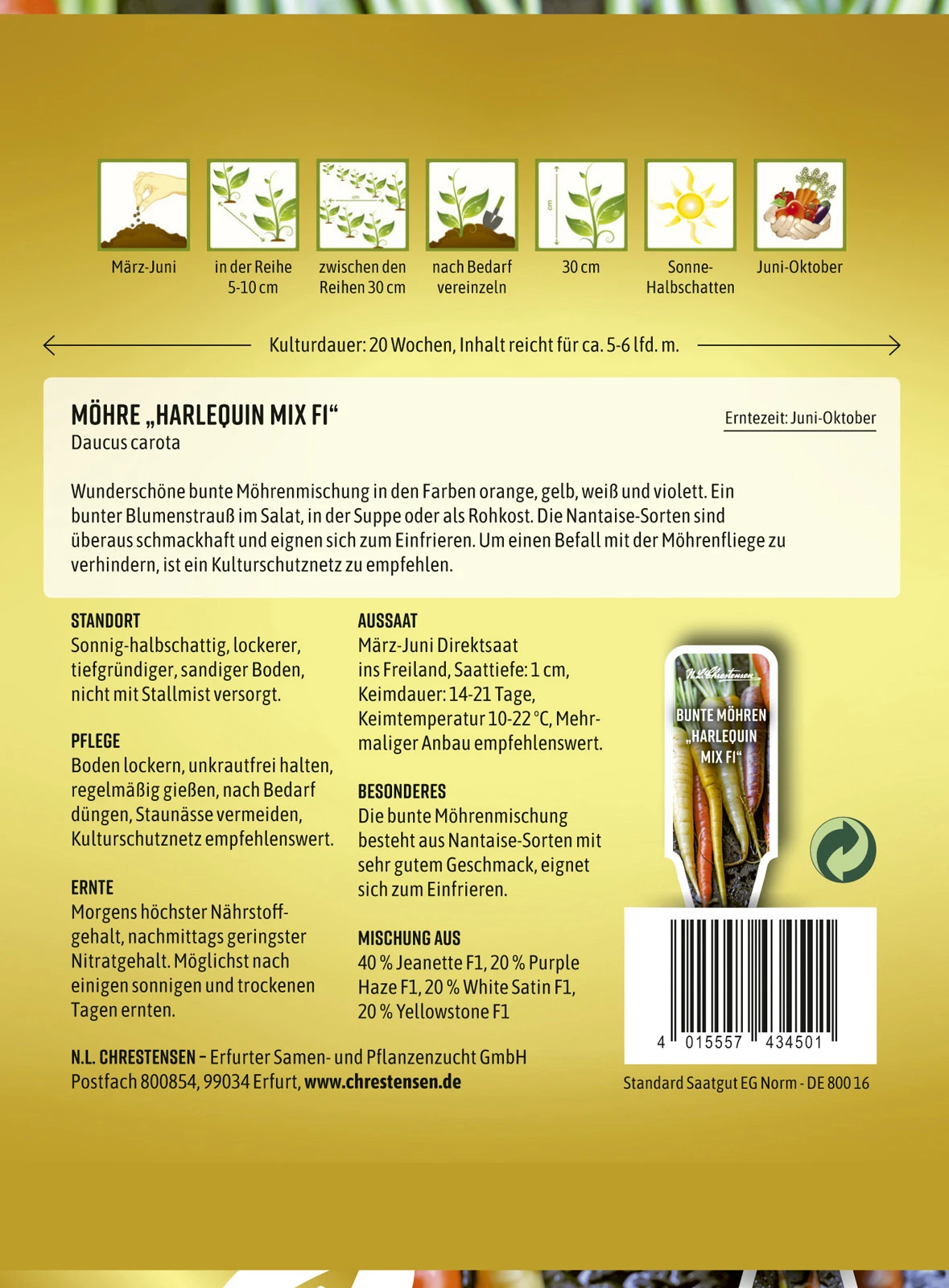 Wunderschöne bunte Möhrenmischung in den Farben: orange, gelb, weiß und violett. Ein bunter Blumenstrauß im Salat, in der Suppe oder als Rohkost. Die Nantaise-Sorten sind überaus schmackhaft und eignen sich zum Einfrieren. Um einen Befall mit der Möhrenfliege zu verhindern, ist ein Kulturschutznetz zu empfehlen.