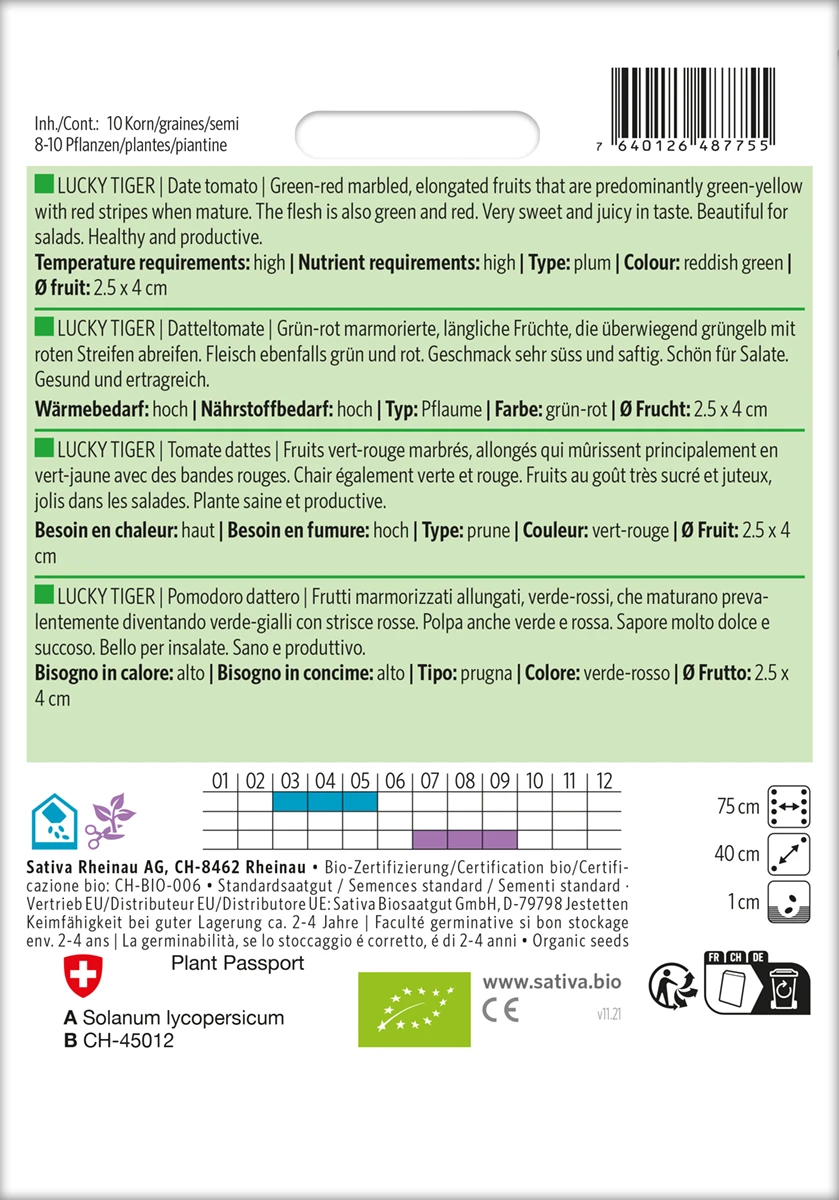 Grün-rot marmorierte, längliche Früchte, die überwiegend grüngelb mit roten Streifen abreifen. Fleisch ebenfalls grün und rot. Geschmack sehr süss und saftig. Schön für Salate. Gesund und ertragreich.