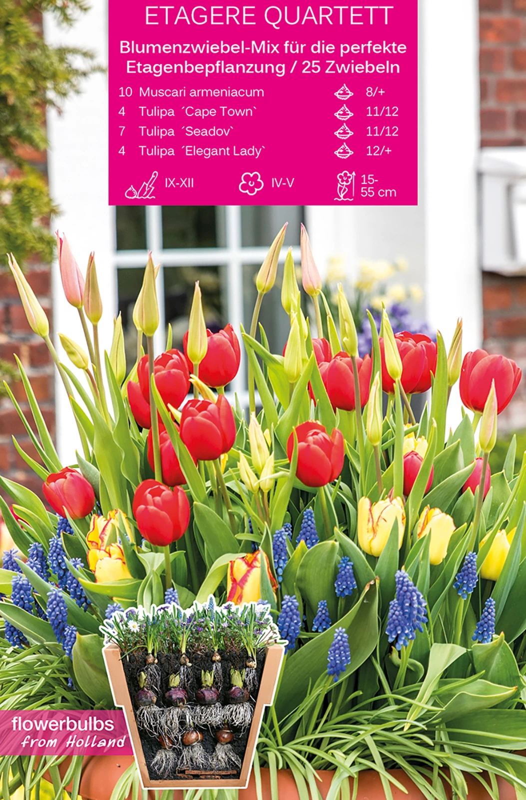 Pflanzen Sie die Blumenzwiebeln einfach in mehreren Schichten in einen Kübel nach der bewährten Etagen- oder Lasagnemethode. Wir haben für Sie die passenden Sorten zusammengestellt. Hier werden mehrere Arten bzw. Sorten, die nacheinander blühen in Schichten übereinander angeordnet. Dabei werden frühblühende Zwiebeln als obere Schicht und die später und ganz spät blühenden Zwiebeln in die mittlere und unterste Schicht gepflanzt. Beim Setzen der Zwiebeln, sollten Sie darauf achten, dass diese nicht direkt übereinanderliegen. Die Blumenzwiebeln sind einzeln verpackt und beschriftet, sodass die Bepflanzung zu Hause ganz einfach nachgemacht werden kann.