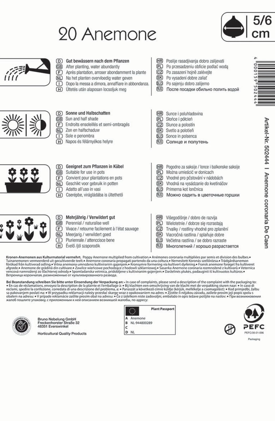 Diese Mischung besteht aus einfachblühenden Kronen-Anemonen der Sorte ‚De Caen‘. Die Blüten schillern von Mai bis Juli in den Farben Weiß, Rosa, Rot und Lila. Mit einer Wuchshöhe von rund 20 cm ist dieser Anemonen-Mix sowohl für Beete als auch Pflanzgefäße geeignet. Als Unterpflanzung von lichten Baum- und Strauchgruppen kann diese Mischung ebenfalls verwendet werden. Die Vielzahl an Blüten lockt zudem Nützlinge wie Bienen und Schmetterlinge an.