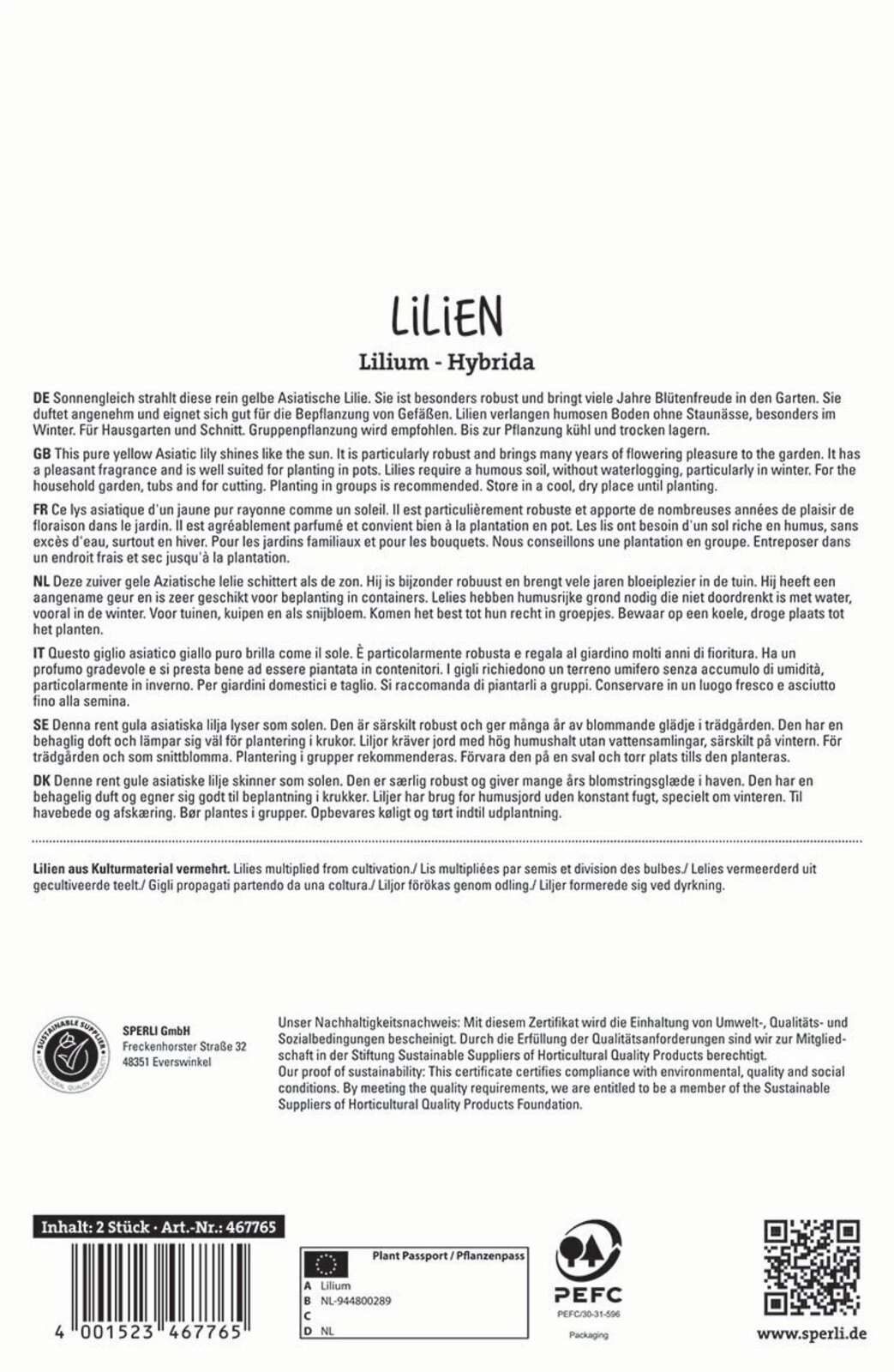 Die Asiatische Lilie ‚Pearl Melanie‘ ist ideal geeignet für alle, die die Farbe Rot lieben: Mit ihren strahlend roten Blüten ist diese Sorte ein richtiger Hingucker! ‚Pearl Melanie‘ entwickelt viele Blüten und wird Dir bei guter Pflege mehrjährig und ausdauernd Freude bereiten. Da die Sorte keinen Duft entwickelt, ist sie gut für Lilienliebhaber geeignet, die schwere, süße Düfte weniger gerne mögen. Im Juni und Juli zeigt die Asiatische Lilie ihre prächtigen Blüten, die als zusätzliche Nahrungsquelle für Insekten dienen. Mit einer Wuchshöhe von 100 cm passt ‚Pearl Melanie‘ in so ziemlich jedes Beet. Geschnitten für die Vase ergeben die Lilien haltbare Schnittblumen, die ein Highlight in Deinen vier Wänden abgeben werden.