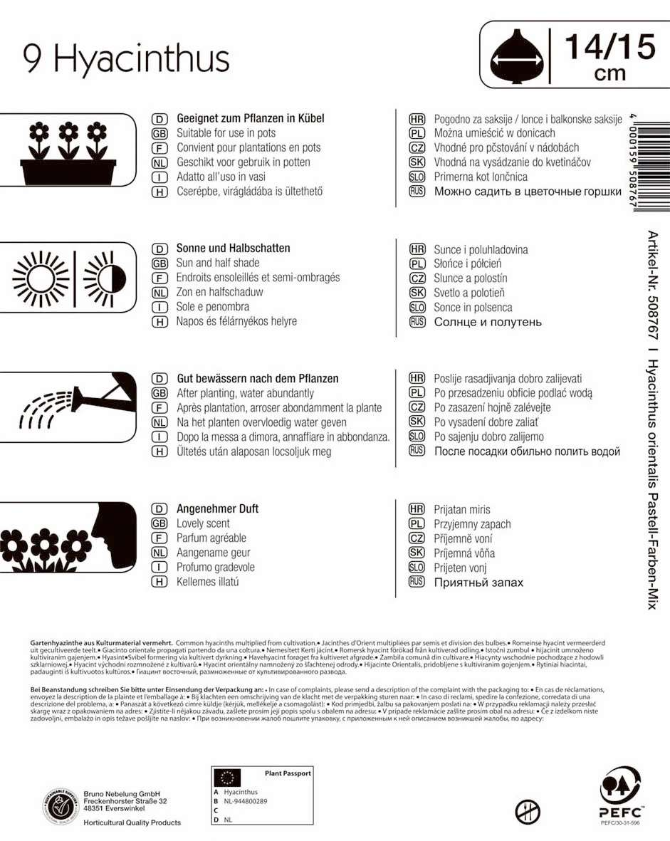 Bei dem Mega-Pack „Hyazinthe Pastell Mischung“ handelt es sich um eine attraktive Mischung an zarten, aufgehellten Hyazinthensorten. Diese Blumen sind wahre Frühlingsbotschafter, denn sie blühen von März bis April in Ihrem Garten oder auf Ihrem Balkon. Da die Hyazinthen lediglich 20 cm hoch werden, können sie problemlos im Kübel gepflanzt werden. Am besten gedeihen sie an einem sonnigen bis halbschattigen Standort. Zudem verbreiten sie einen angenehmen Duft.