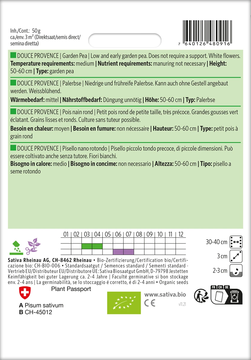 Niedrige und frühreife Palerbse. Kann auch ohne Gestell angebaut werden. Weissblühend.