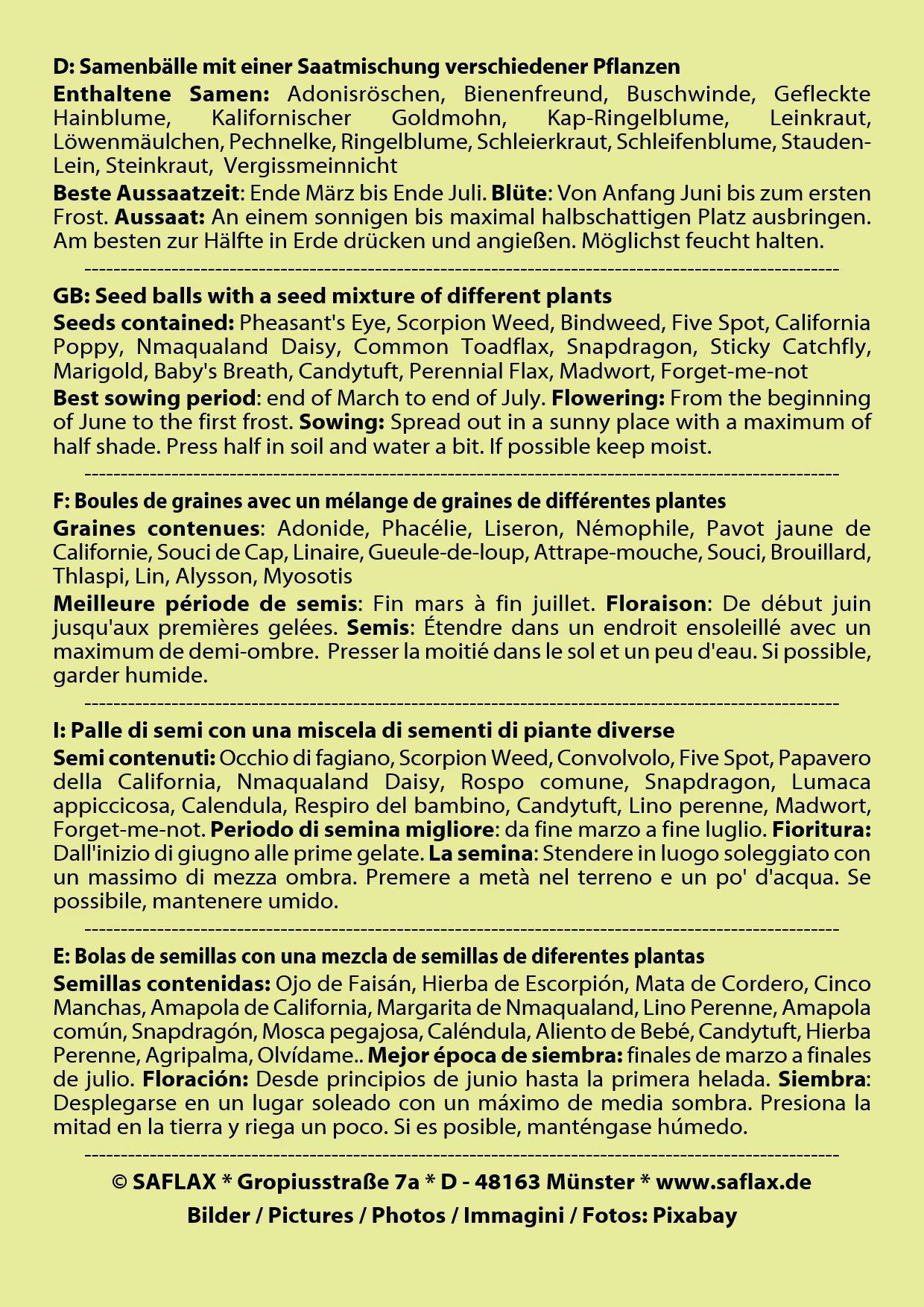 Samenbälle mit einer Saatmischung verschiedener Pflanzen Beste Aussaatzeit: Ende März bis Ende Juli. Blüte: Von Anfang Juni bis zum ersten Frost. Aussaat: An einem sonnigen bis maximal halbschattigen Platz ausbringen. Am besten zur Hälfte in Erde drücken und angießen. Möglichst feucht halten.