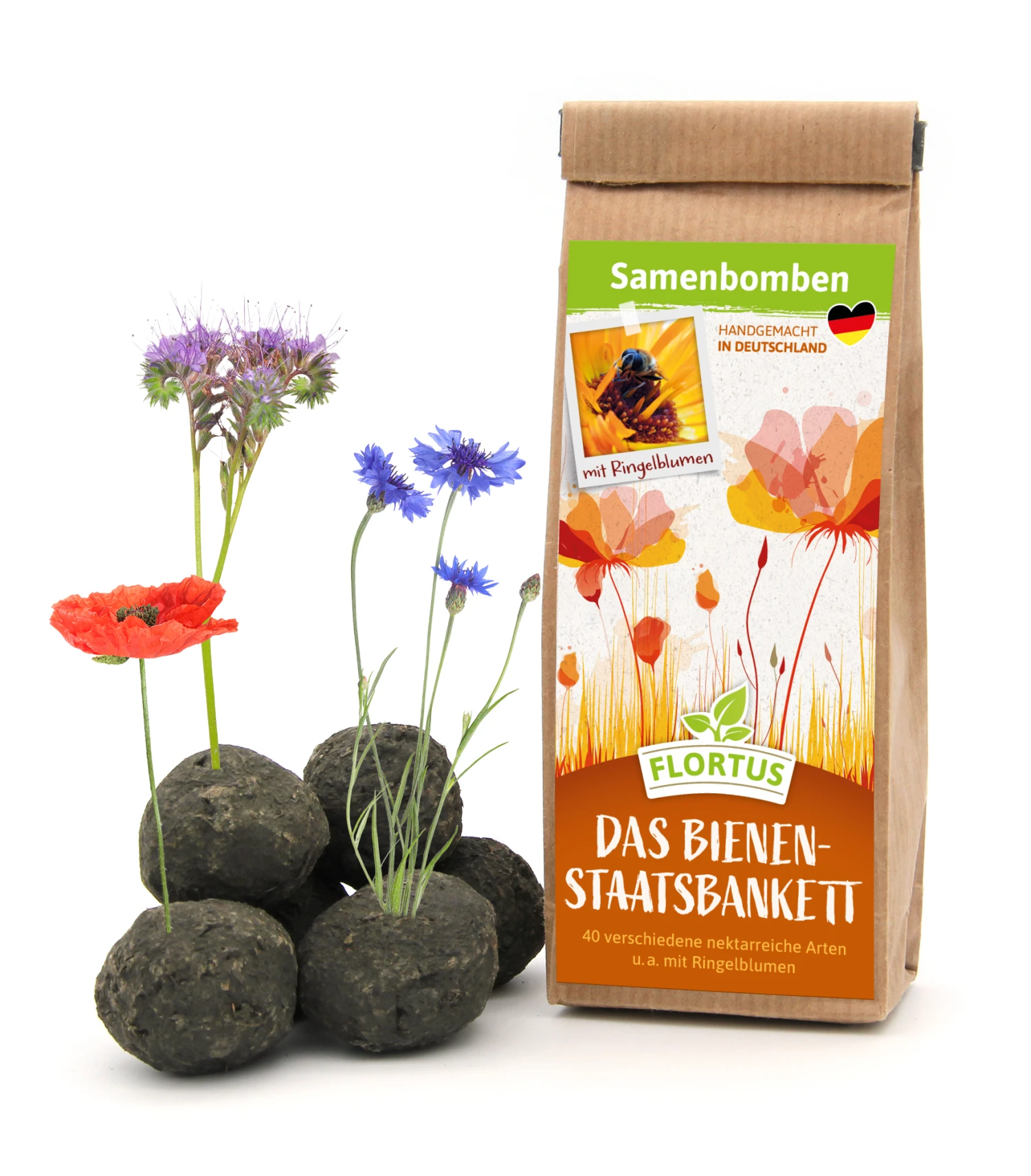 Wir möchten, dass die Pflanzenwelt in den Städten bunter wird. Das Einheitsgrün vielerorts bedeutet für Bienen, Hummeln und Schmetterlinge ökologisches Ödland. Dabei ist es leicht, eine reiche Artenvielfalt zu schaffen. Die FLORTUS Samenbomben können dazu beitragen! Für Garten oder Balkon, als Gastgeschenk oder Giveaway. Das ‚Bienenstaatsbankett‘ enthält mehr als 40 Samen nektar- und pollenreicher Sommerblumen, ein buntes Bienenfutter.