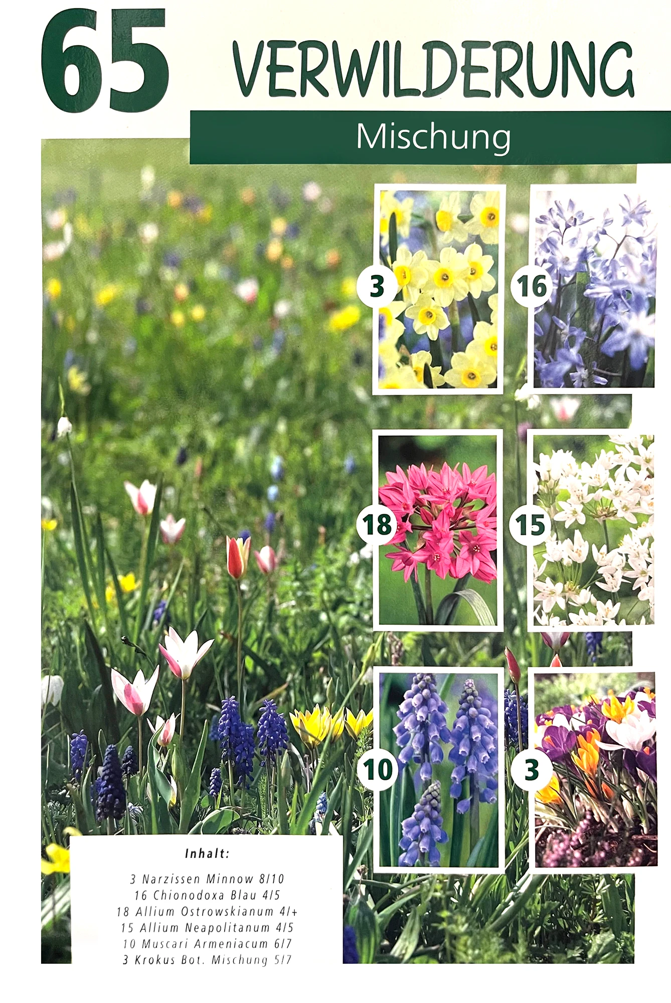 Diese Mischung besteht aus: 3 Stück Nacissus Minnow, 16 Stück Anemone de Caen, 10 Stück Muscari Armeniacum, 18 Stück Allium Ostrowskianum, 15 Stück Dasystemon Tarida, 3 Stück Crocus Botanic Mix
