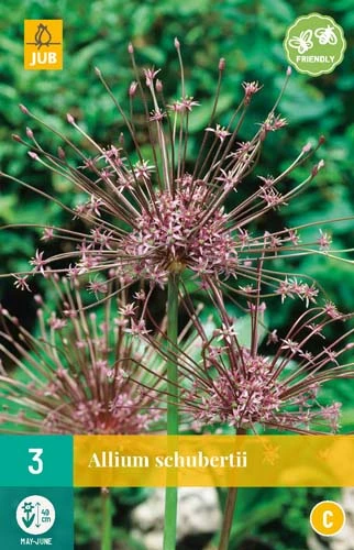 Eine besondere Allium-Art. Die Dolden haben einen Durchmesser von mehr als 30-35 cm. Jede einzelne Blume hat einen Stiel, der in der Länge von 6-20 cm variiert. Schubertii wird wegen der etwas „explosiven“ Blütenstände auch „Feuerwerks-Allium“ genannt. Nach der Blüte bleiben die verblühten Dolden noch lange dekorativ im Garten. Zur Einbürgerung geeignet. Dieser Allium zieht während der Blüte Schmetterlinge und Bienen an.